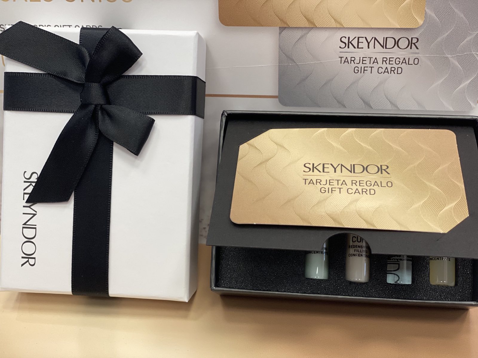 Карта подарък опакована в красива бяла кутийка с панделка и с подарък 4 ампули за грижа за кожата на лицето!